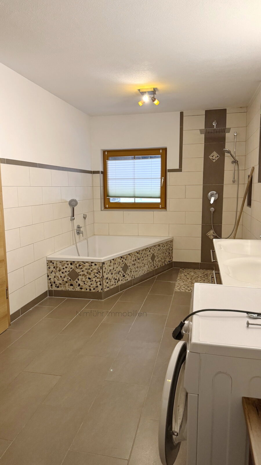 – großes Badezimmer ( ca. 14 m² ) mit Doppelwaschbecken, Untertischverbau, Spiegelschrank, Badewanne, Dusche, Waschmaschinenanschluss, Toilette und 3 Fenster