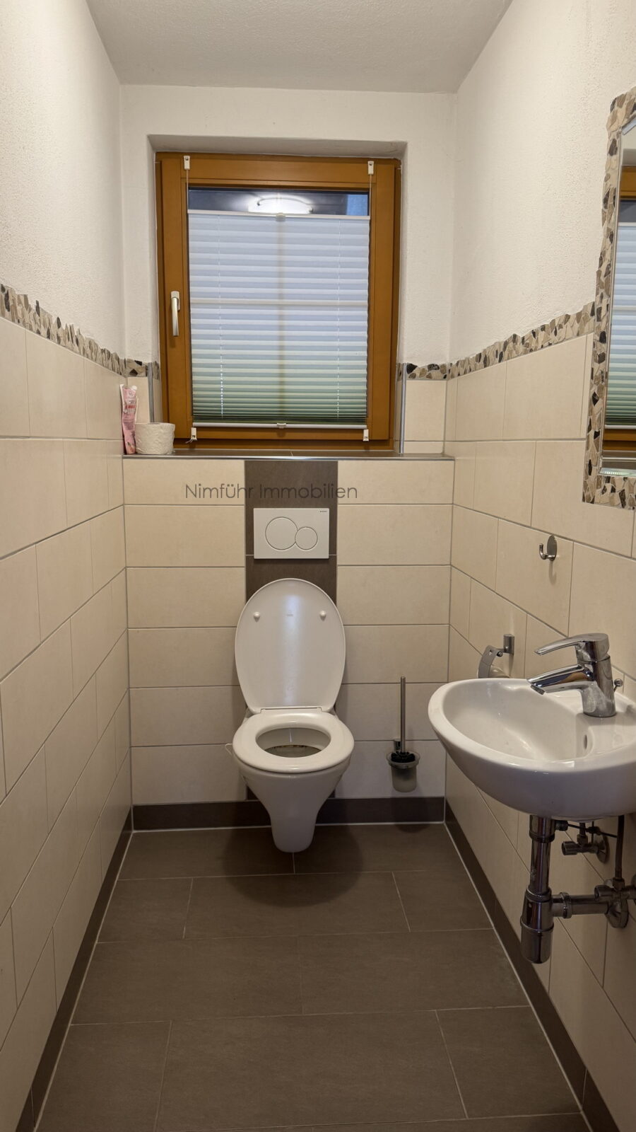 – Toilette mit Waschbecken, Spiegel und Fenster
